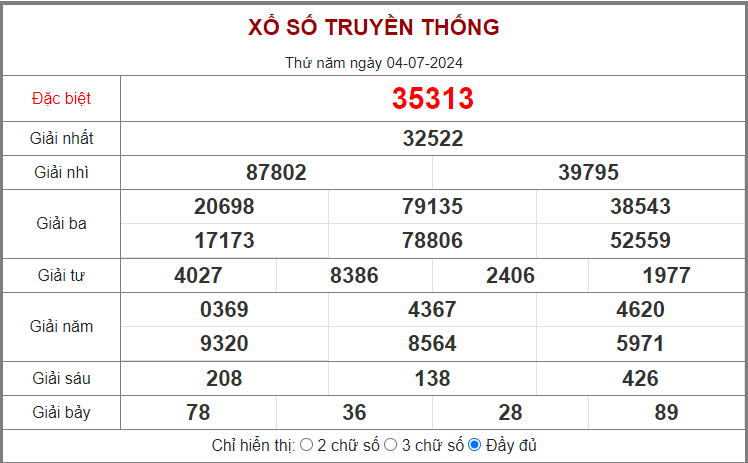 kết quả giải đặc biệt xsmb ngày 04/07 là 35313, giải nhất 32522, vậy ta có kết quả thống kê là là: